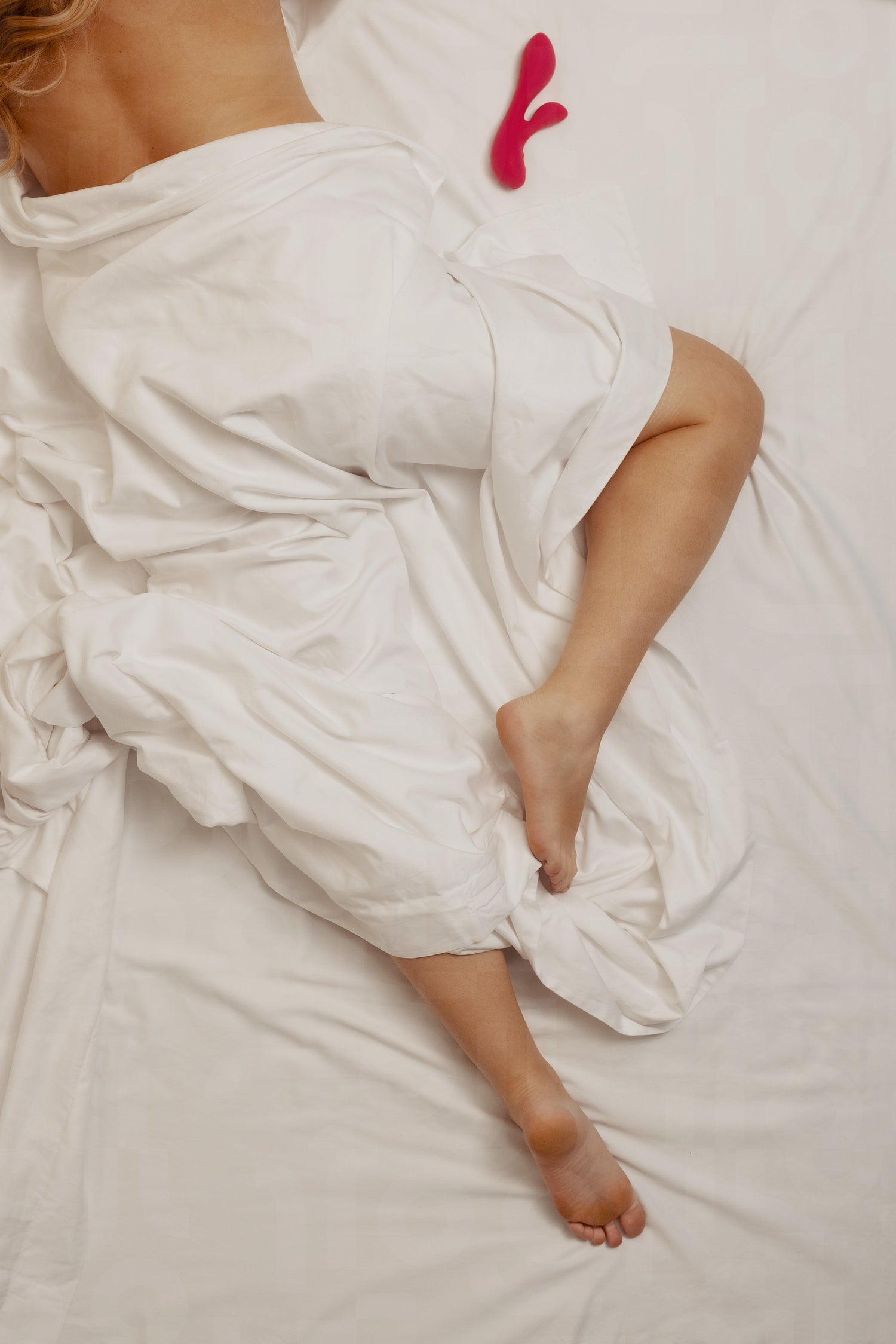 Woman lying on a bed with white covers, exploring erotic pleasure with a vibrator