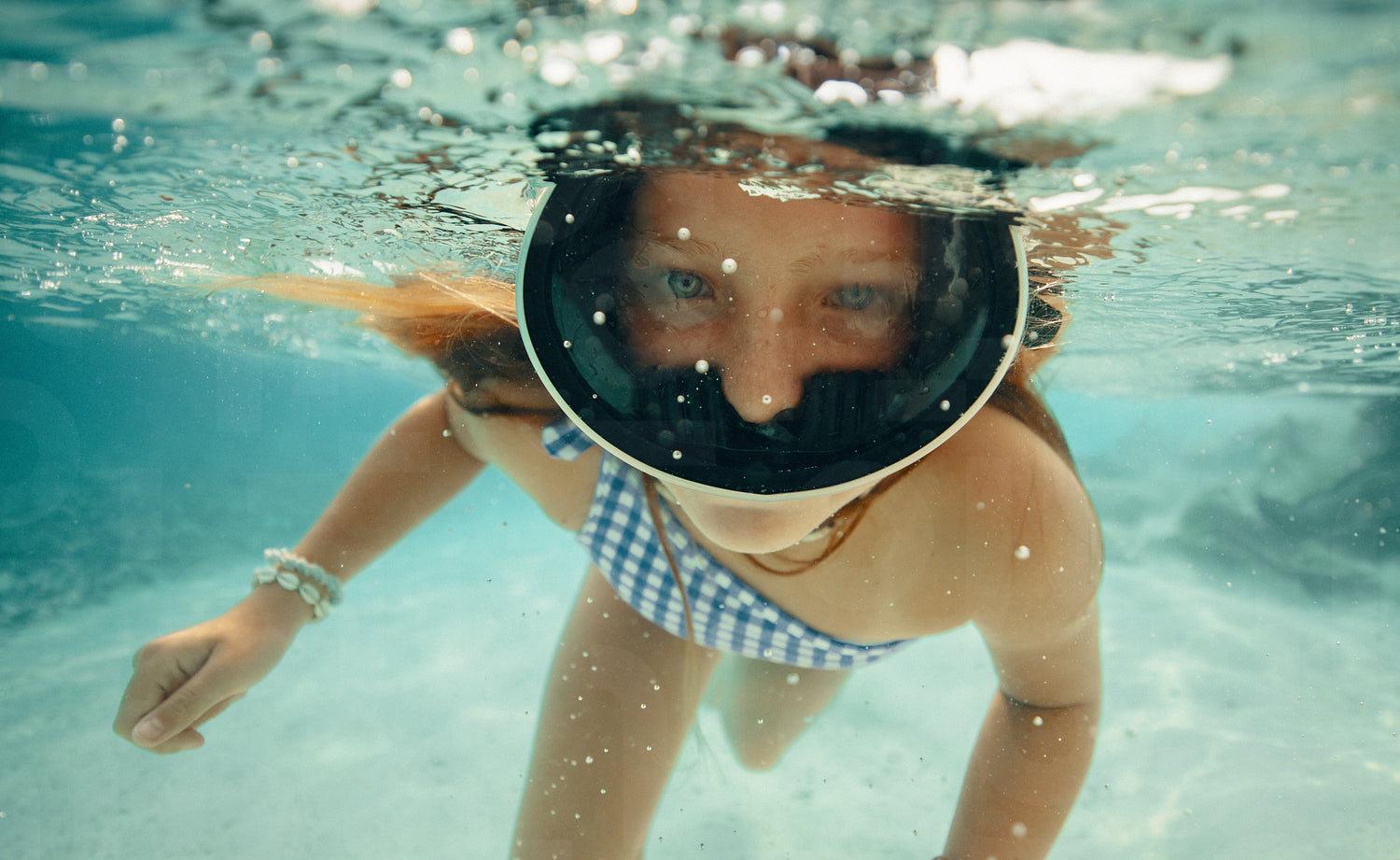 Young girl with a mask enjoying swimming underwater in a tropical destination. Fun, adventure, and exploration in a beautiful vacation setting.