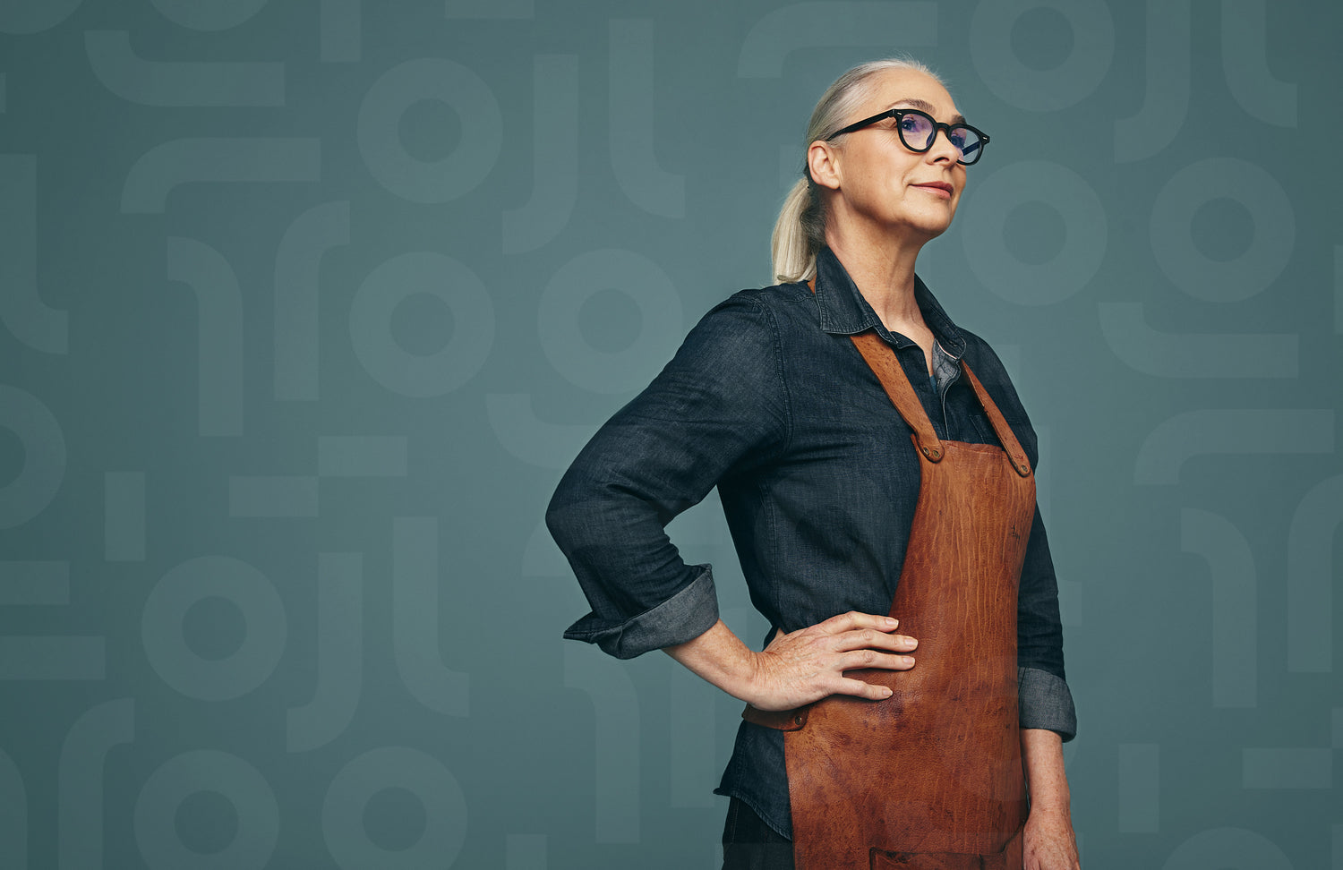 Experienced jewellery maker looking away thoughtfully while standing against a studio background. Mature female goldsmith wearing a brown leather apron in a studio.