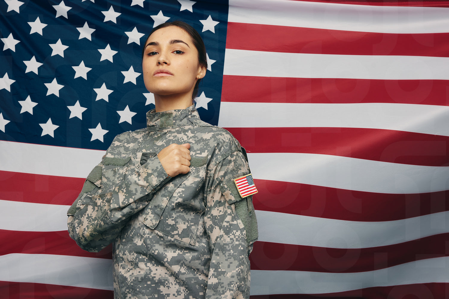 Patriotic army soldier swearing an oath while standing against the United States flag. Courageous young servicewoman wearing the camouflage uniform of the United States Armed Forces.