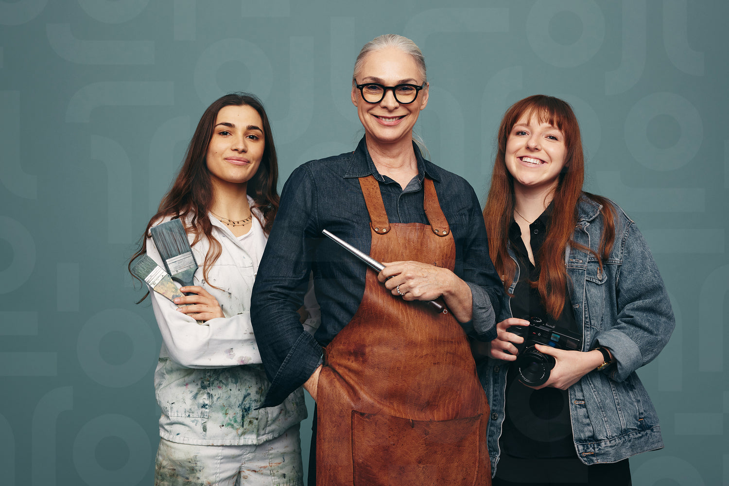 Women from different creative professions standing together in their occupational attires. Three female professionals smiling at the camera while standing against a studio background.