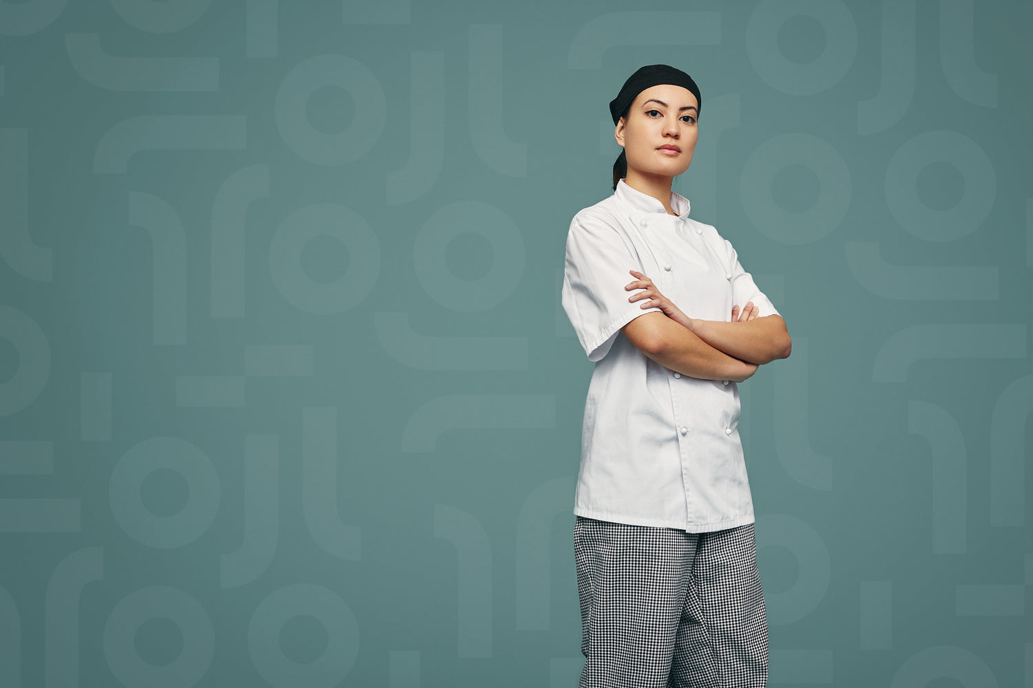 Young culinary chef looking at the camera while standing with her arms crossed. Professional cook wearing a white coat and a black bandana against a studio background.