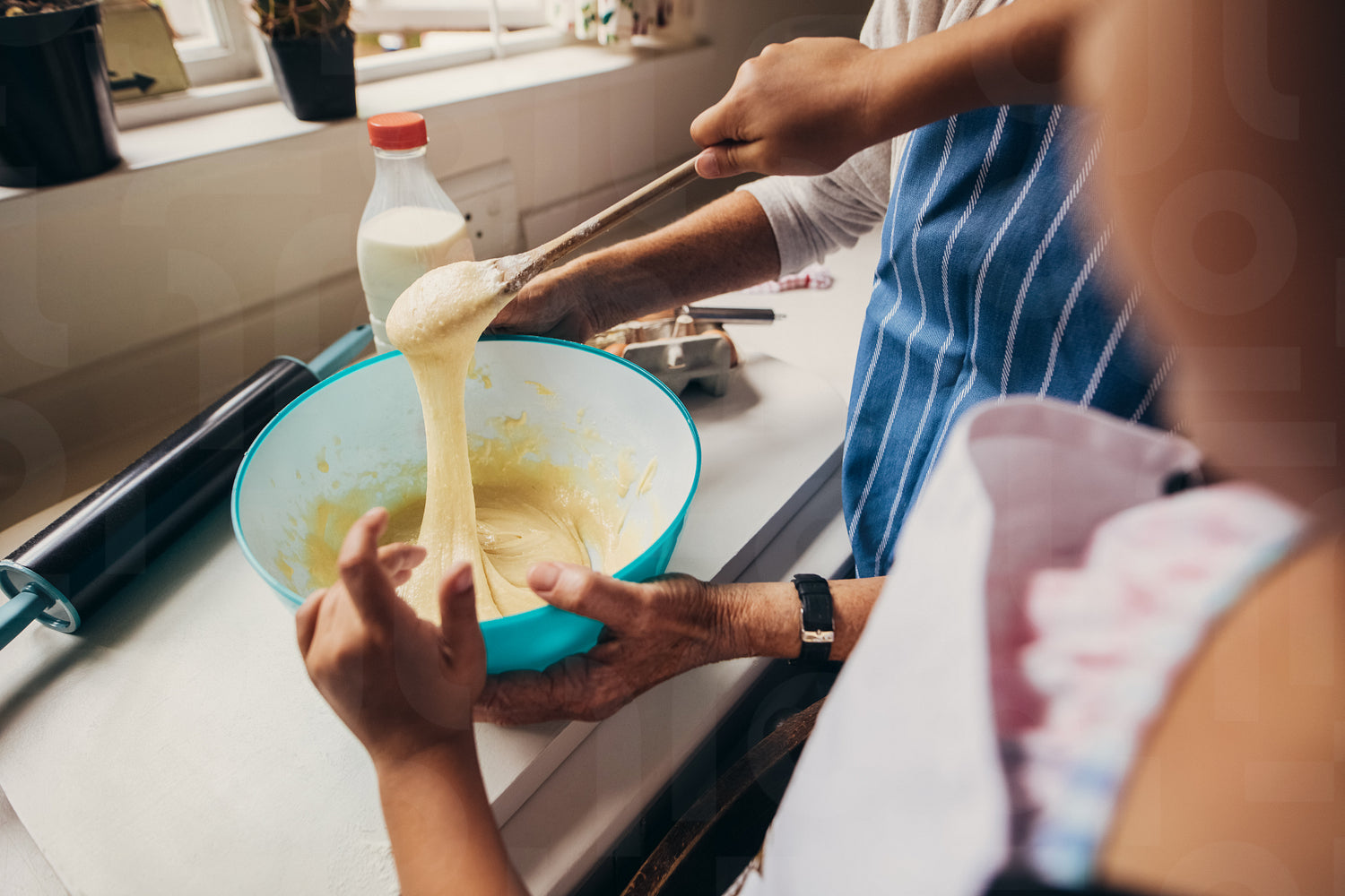 Close up of hands of two people making cake batter. Women mixing batter in a bowl in kitchen.