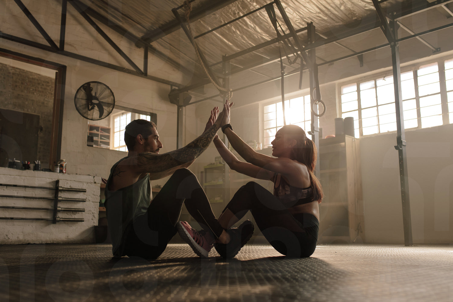 Couple exercising together at gym. Fit man and woman sitting on floor and doing a high five during a workout routine.