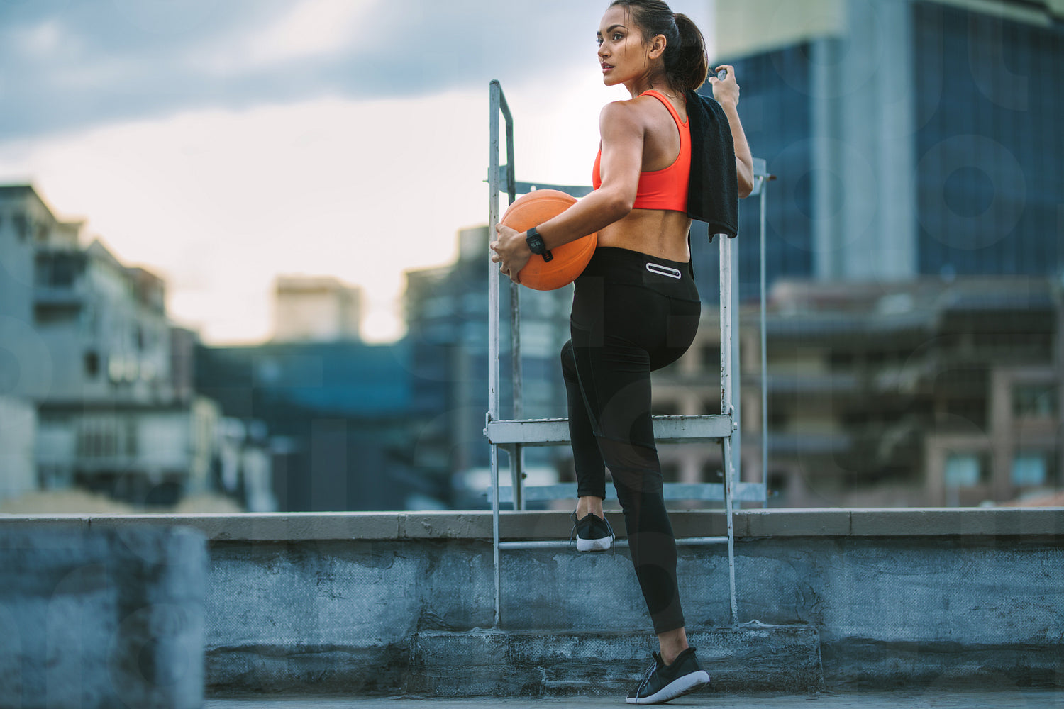 Woman in fitness wear standing on rooftop holding a basketball. Rear view of a fitness woman standing near a rooftop staircase and looking away.