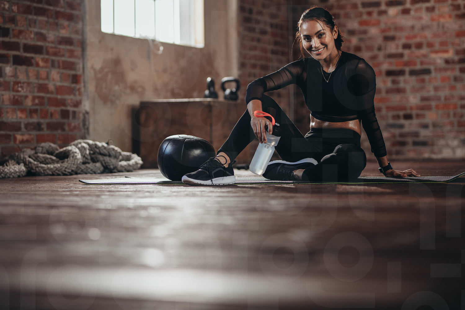 Portrait of a smiling woman during a break in the gym. Female sitting on floor looking at camera and smiling after workout.