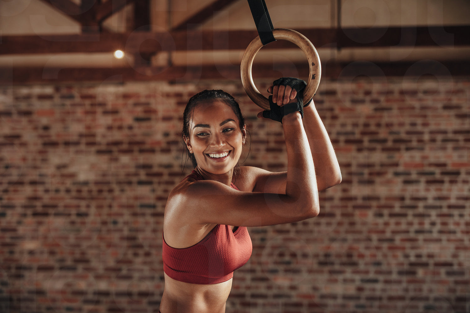 Fit woman holding gymnast rings at the gym
