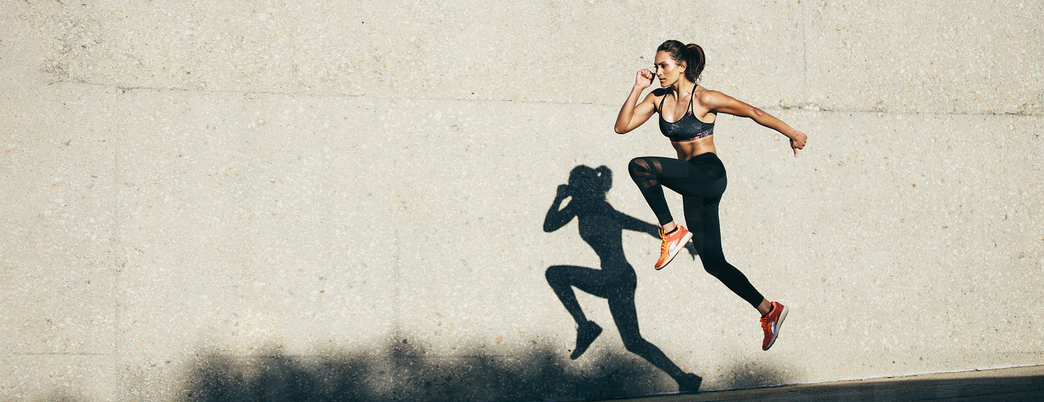 Fitness female model doing cardio exercise in morning. Panorama background of fitness woman running outdoors.