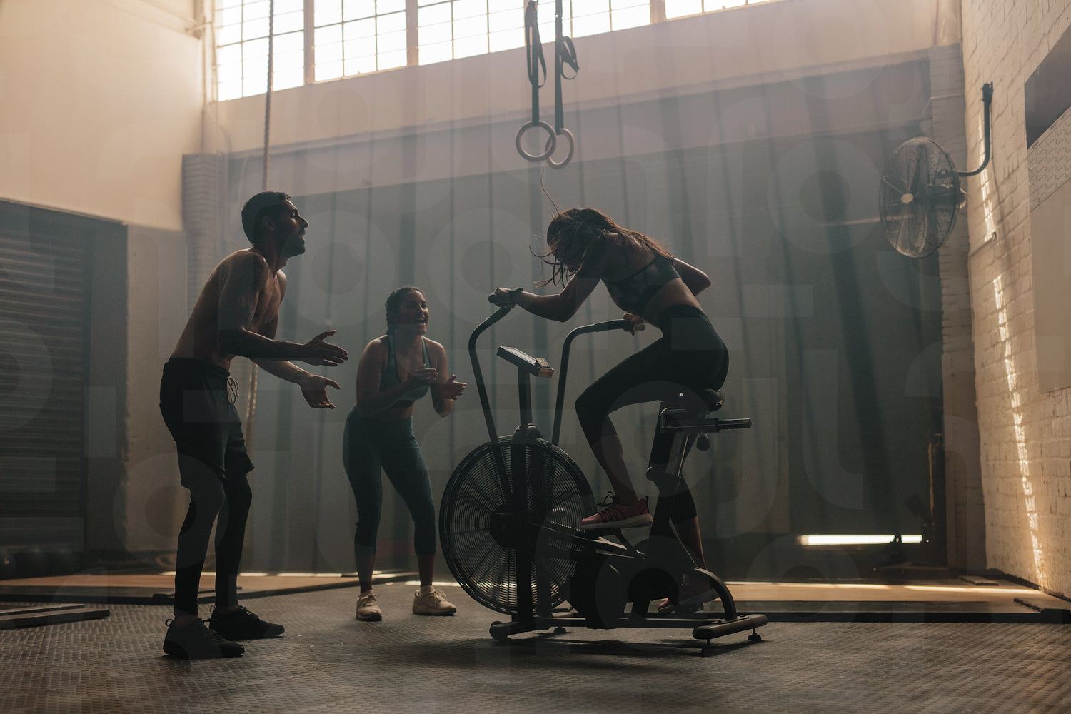 Woman exercising on air bike at gym with friends motivating. Female using air bike for workout at cross training gym with friends.
