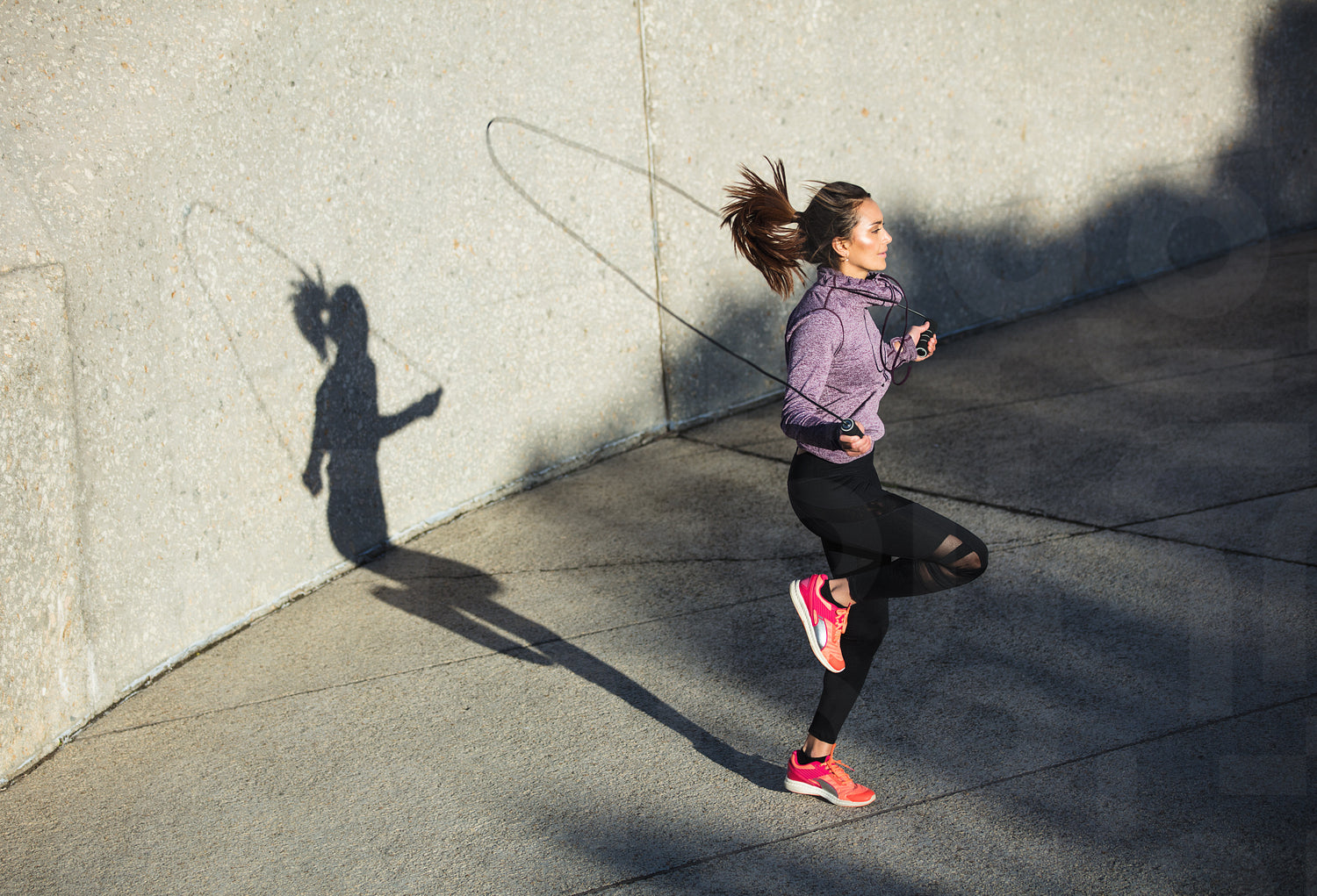 Fitness woman skipping with a jump rope outdoors. Female doing fitness training in morning.