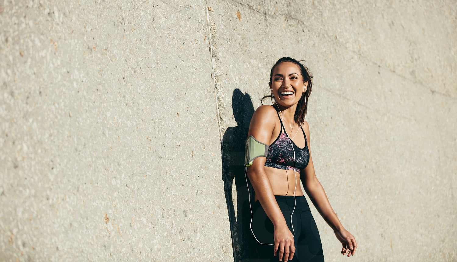 Healthy and fit woman standing by a wall outdoors and smiling. Female taking a rest after training session outdoors.