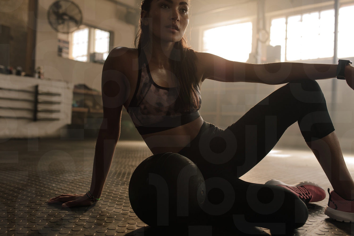 Healthy woman with medicine ball resting in gym after workout. Female taking a break from workout.