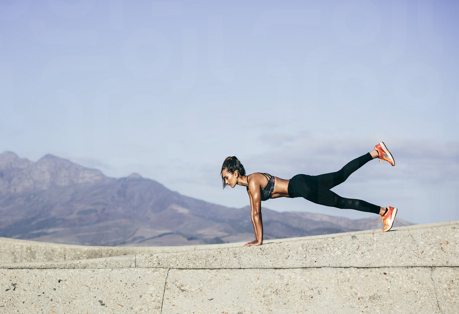 Muscular young woman doing push ups. Side view shot of healthy young female doing core workout outdoors.