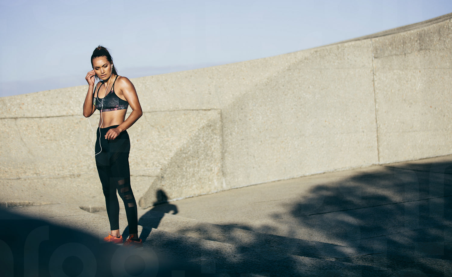 Young female athlete taking break from fitness workout. Sports woman standing outdoors and adjusting her earphones.