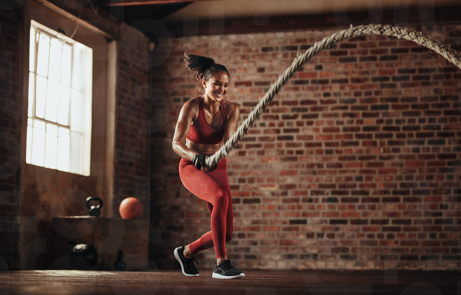 Strong female athlete working out with battling rope at gym. Healthy woman moving battle rope in wave motion and smiling.