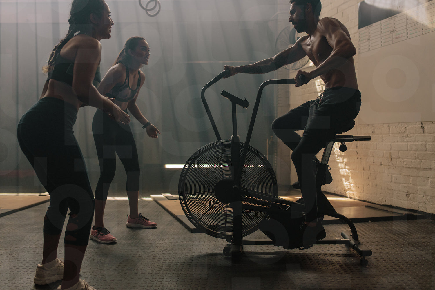 Two women motivating man exercising on air bike in gym. Man doing intense workout on gym bike with females.