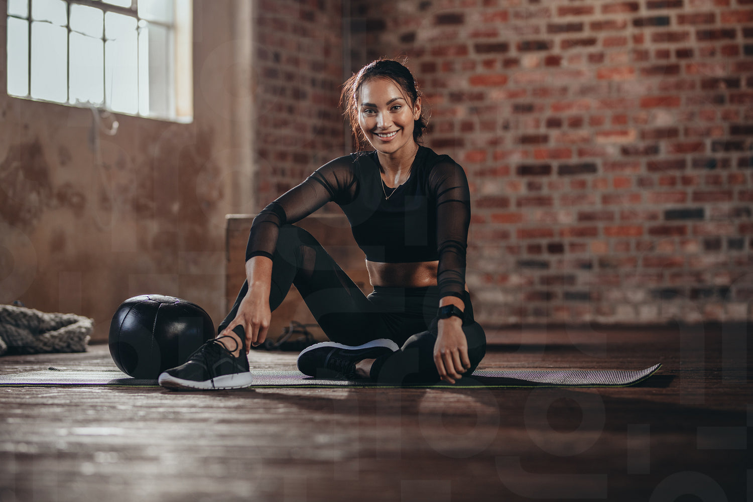 Portrait of a young woman during a break in the gym. Hispanic female sitting on floor looking at camera, resting after workout.