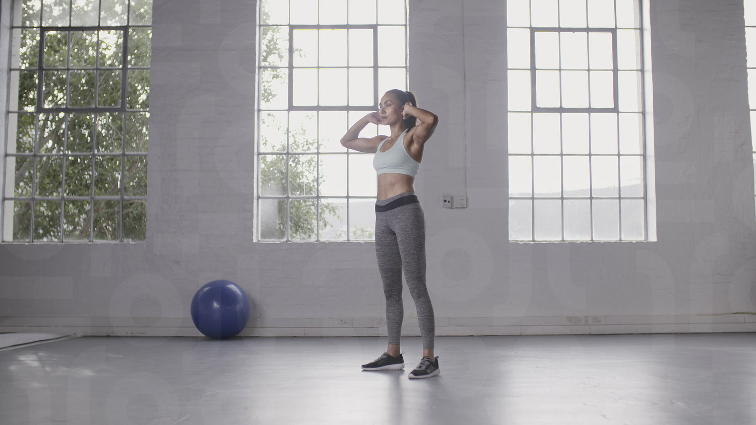 Sporty woman practicing squats exercises in fitness studio. Caucasian woman in sportswear doing squats exercise routine at gym.