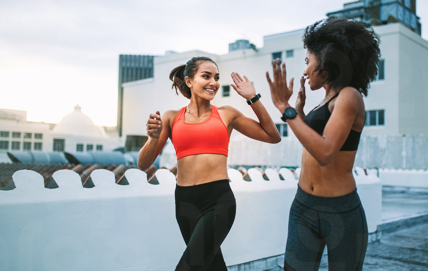 Two fitness women jogging on rooftop in the morning and giving high five. Women athletes in cheerful mood doing fitness training on rooftop.