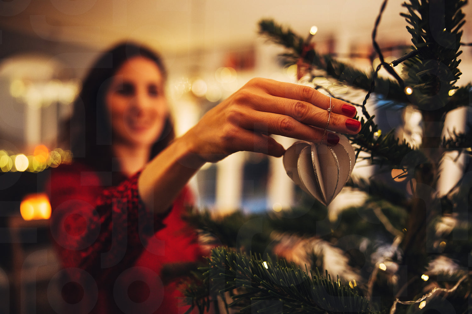 Close-up of a woman decorating Christmas tree. Hand of a woman tying decorative on Christmas tree.