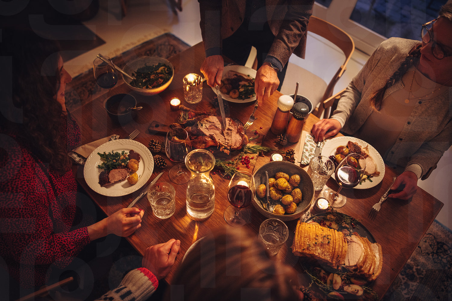 Top view of dining table during Christmas dinner at scandinavian home. Senior man serving roasted turkey to family.