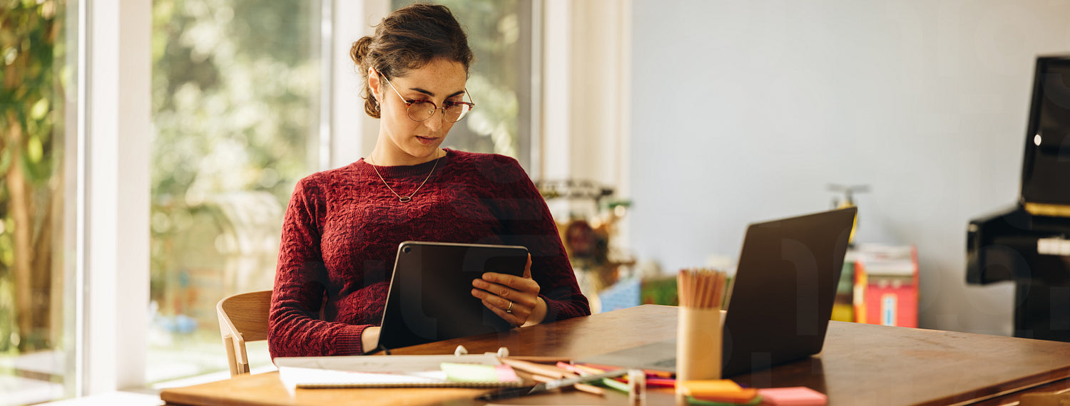 Woman artist sitting at table and using graphic tablet for making illustrations. Female illustrator working from home.