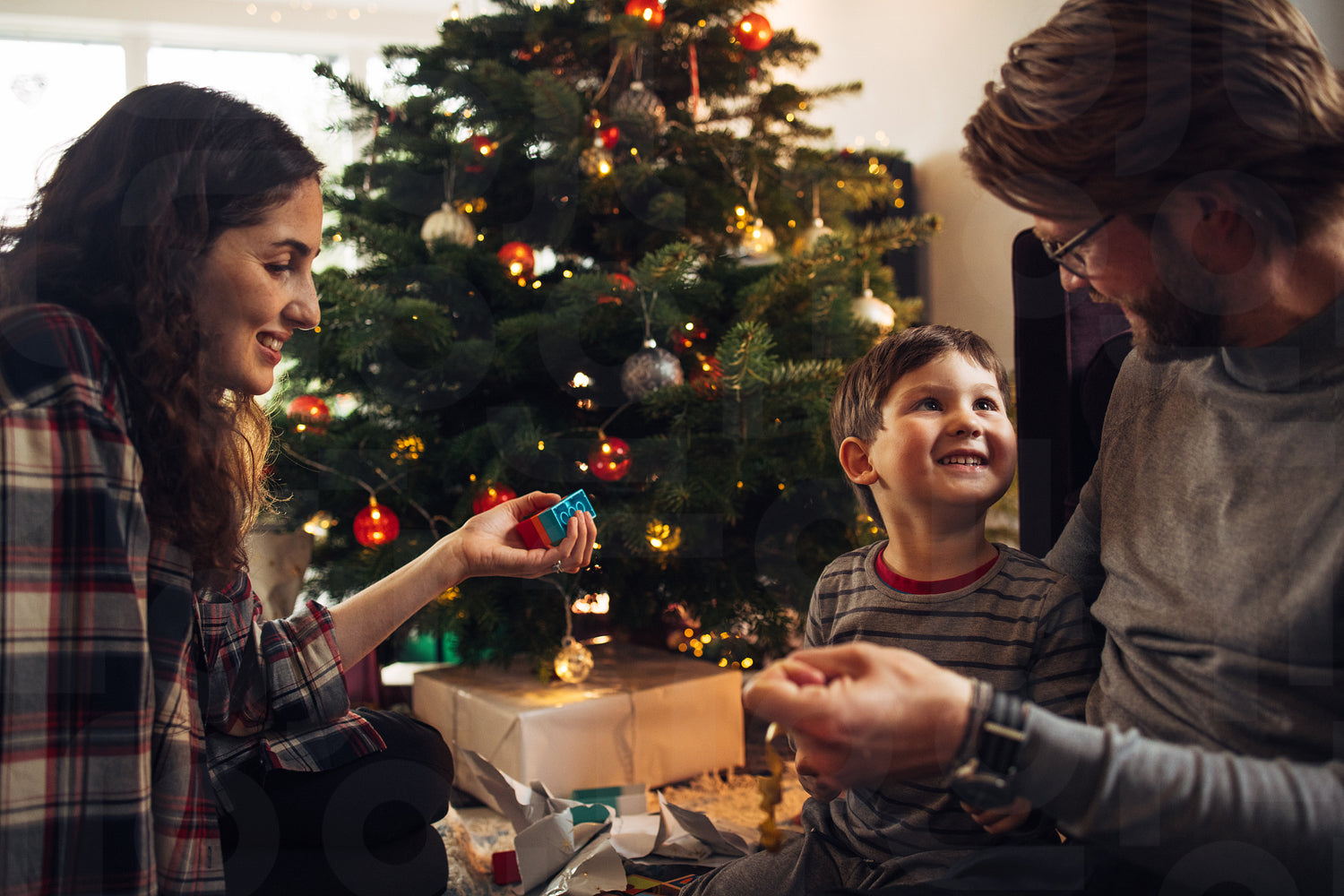 Happy small family celebrating Christmas together. Father, mother and son sitting by Christmas tree having fun.