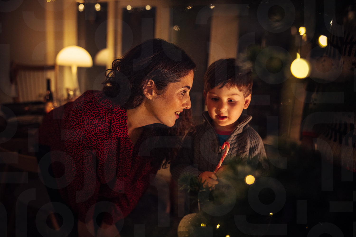 Mother and son placing candy cane on Christmas tree at home. Young woman talking with her son while decorating Christmas tree.