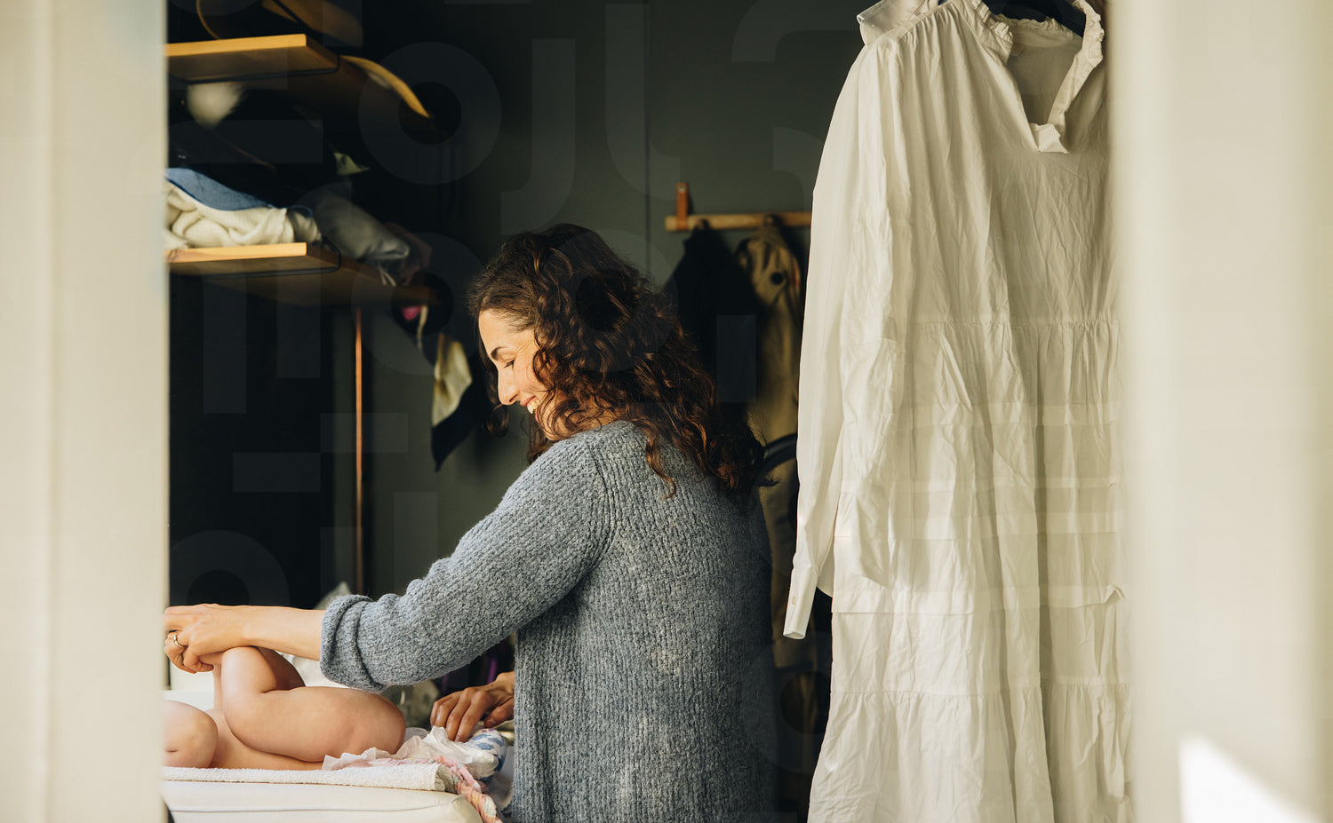 Woman changing diaper of her baby. Smiling mother changing baby diaper at home.