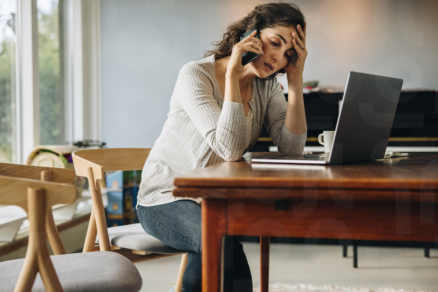 Woman having headache talking on cellphone while working from home. Woman sitting at table with laptop computer looking stressed out while talking over phone call.
