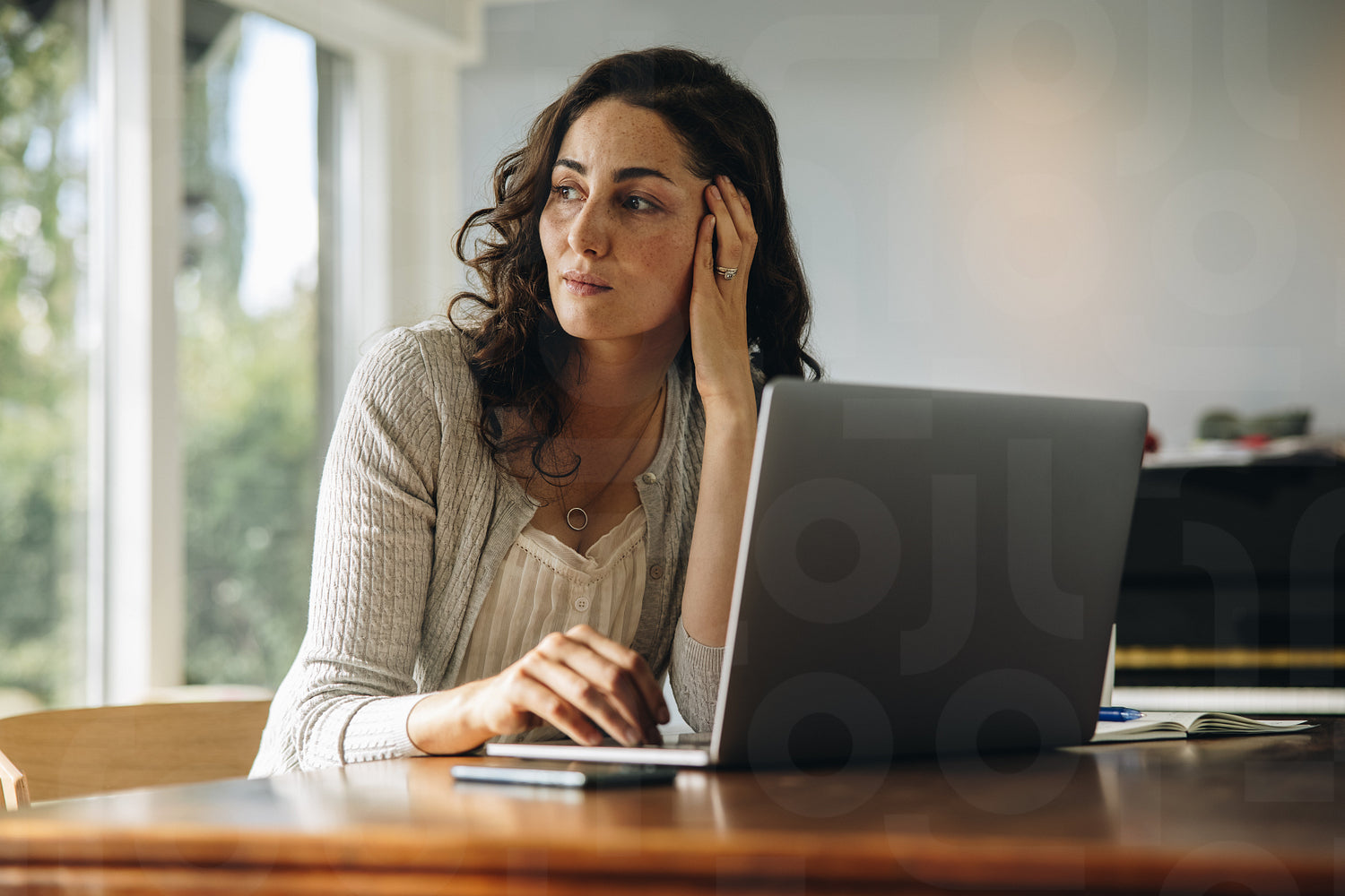 Female sitting at her work desk looking away and thinking. Stressed woman taking a break to come up with solution.
