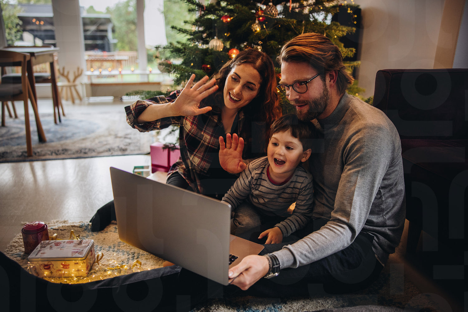 Family sitting on floor having a video call on laptop during christmas. European family greeting friends during a video call.