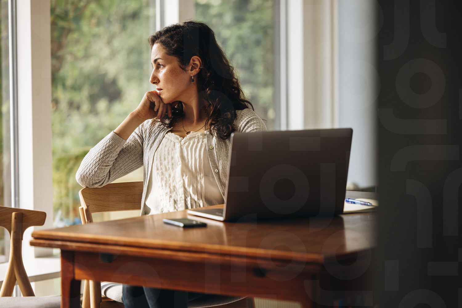Thoughtful female looking away with hand on chin. Woman sitting at home with laptop on tablet looking away and thinking.