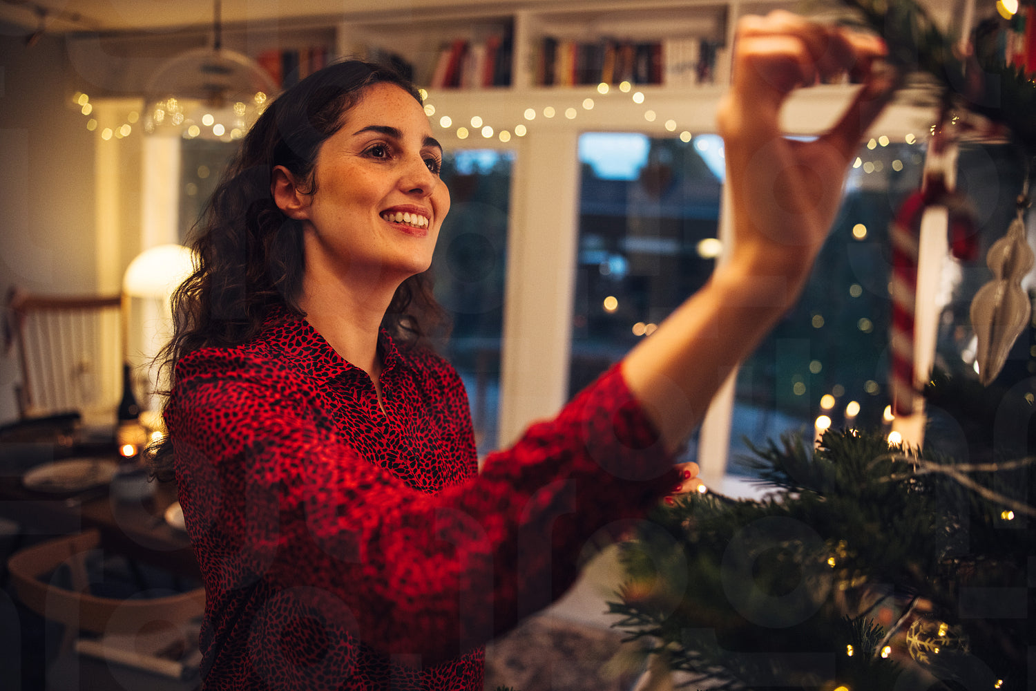 Woman decorating Christmas tree at home. Female hanging decorative items on Christmas tree indoors.
