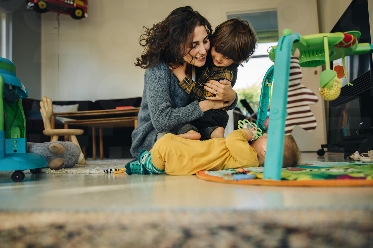 Mother with her two kids at home. Woman on maternity leave having fun with her children indoors.