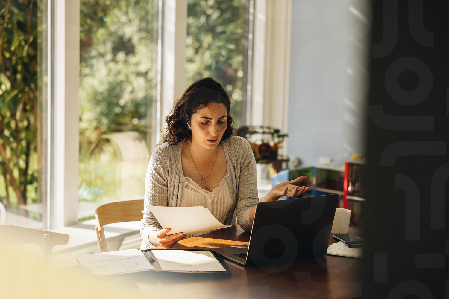 Woman doing some paperwork at home. Female reading a document while working on laptop.