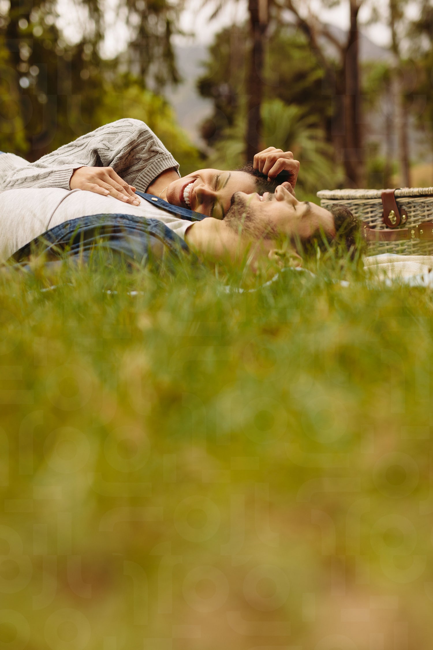 Loving young couple lying together at park. Man and woman on a picnic relaxing.