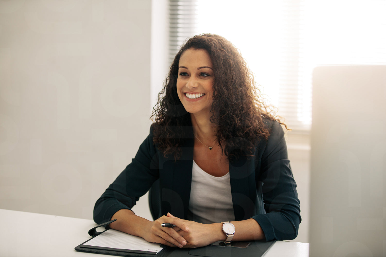 Smiling businesswoman sitting at her desk in office holding a pen and a notepad folder. Businesswoman with curly hair in formal clothes sitting at her desk in office.
