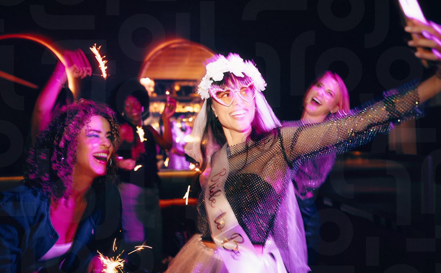 A group of women celebrate a bachelorette party with energy and sparklers. They enjoy the nightlife while documenting memories with a selfie and joyful smiles. Photo has intentional 35mm film grain.