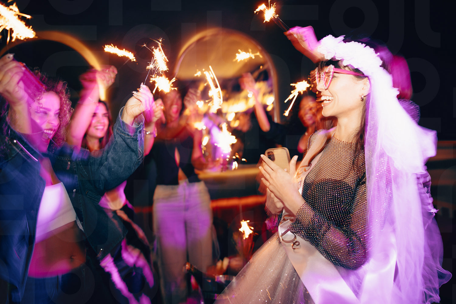 A cheerful bride-to-be enjoys a lively celebration, joined by friends holding sparklers, sharing laughter and joy. This photo has intentional use of 35mm film grain.