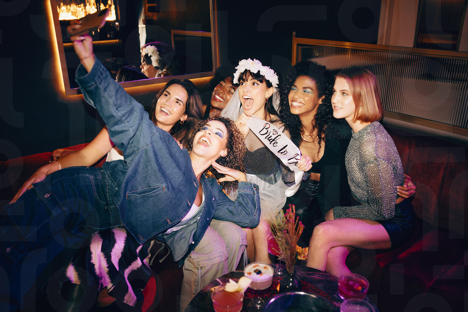 Six friends enjoying a bachelorette party night out with laughter, smiles, and positive energy as they create lasting memories on this special occasion. Photo has intentional use of 35mm film grain.