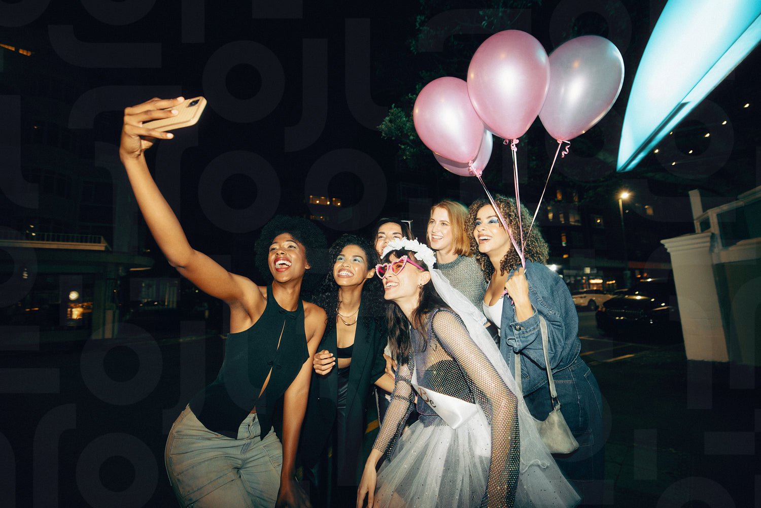 A group of friends celebrates a bachelorette party at night, enjoying the moment while capturing memories. This photo has intentional use of 35mm film grain.