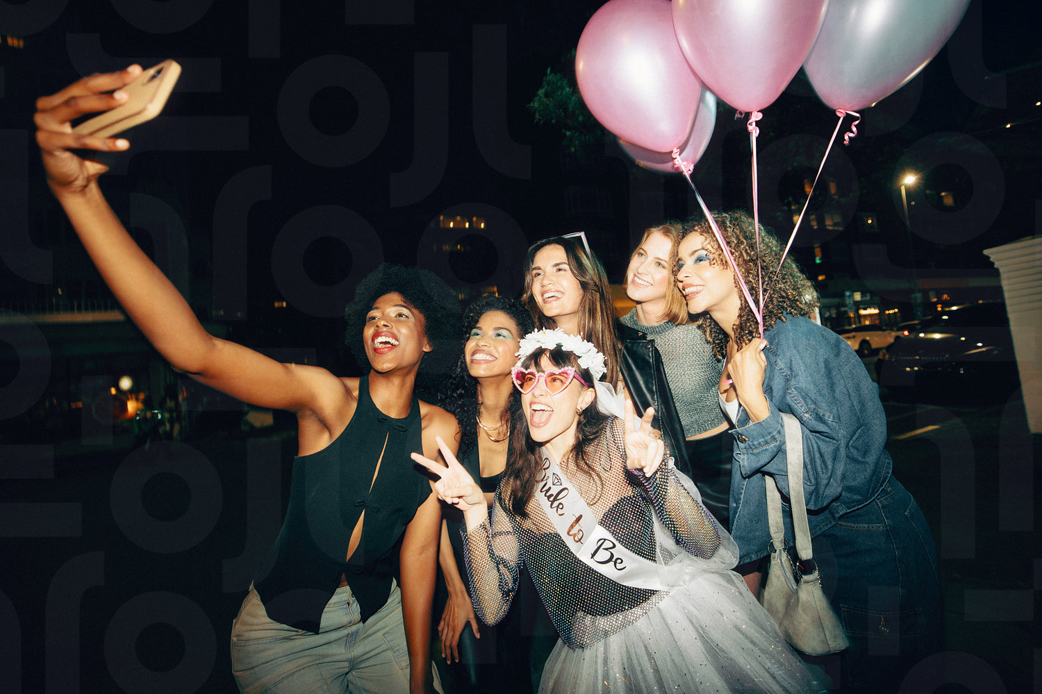 A cheerful group of friends pose together for a selfie at night, showcasing festive vibes and balloons. This photo has intentional use of 35mm film grain.