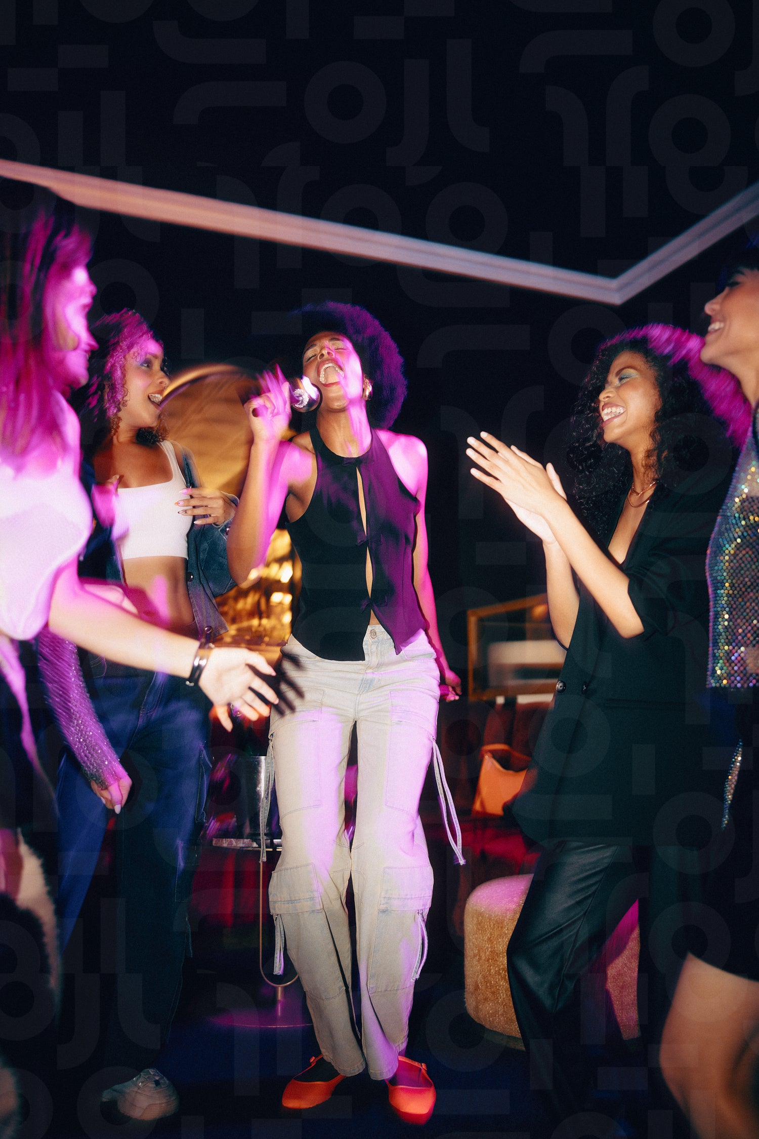 Group of friends enjoying karaoke and celebration in a vibrant indoor setting