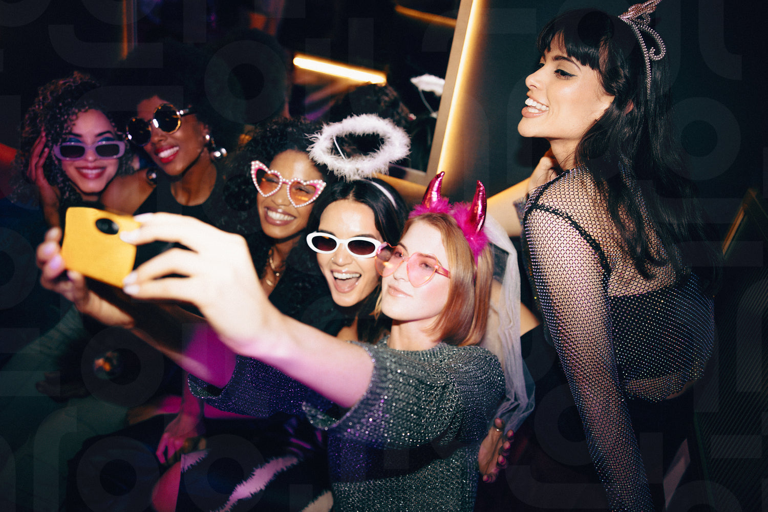 Friends enjoying a vibrant party while taking a cheerful selfie in creative costumes. This photo has intentional use of 35mm film grain.