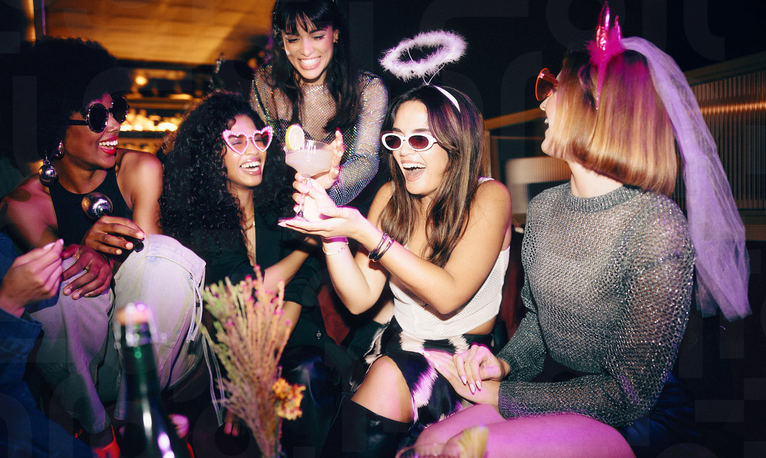 A lively group of friends celebrating a bachelorette party, wearing themed accessories and laughing. The atmosphere is fun and filled with excitement. This photo has intentional use of 35mm film grain.