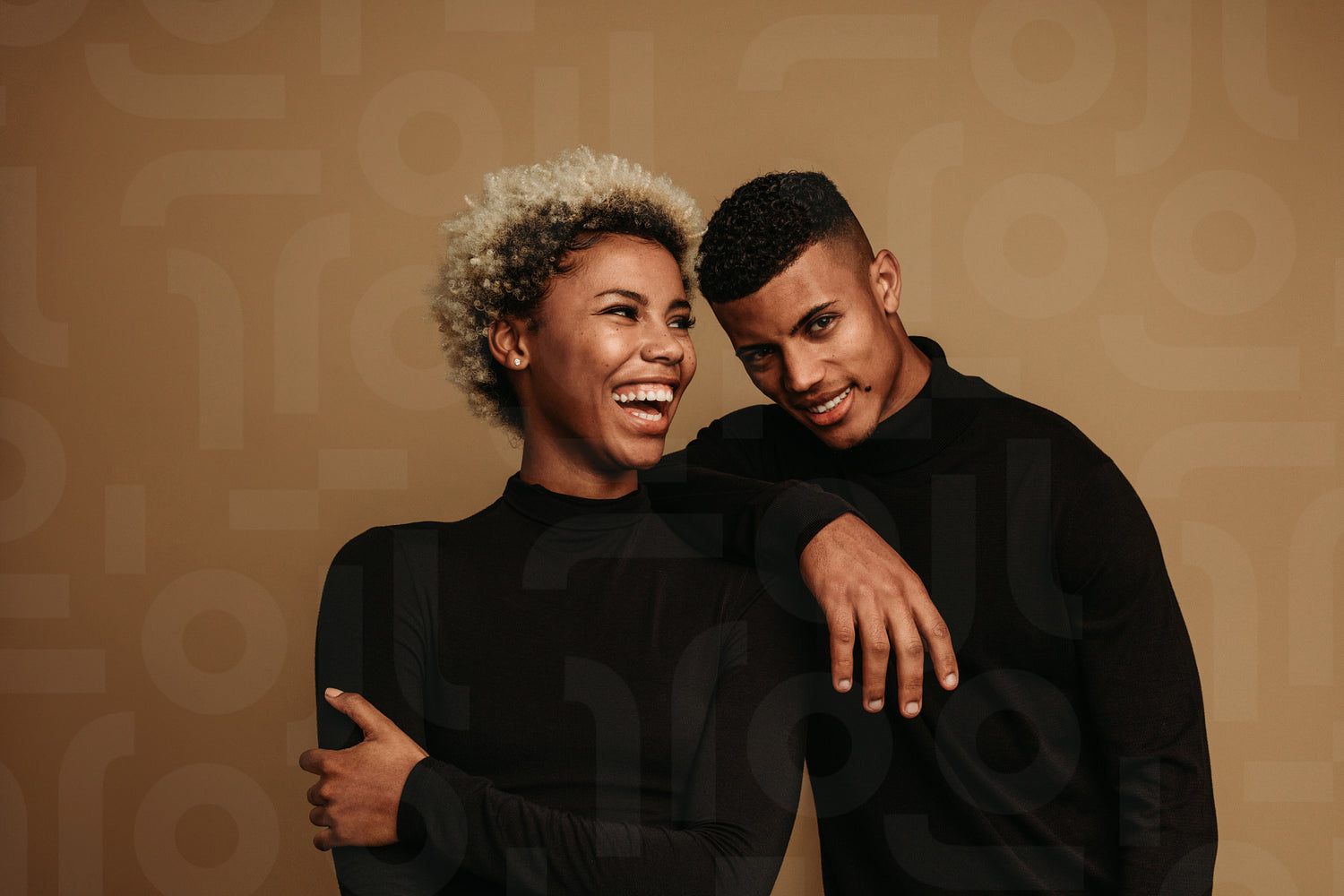 Happy couple standing together and laughing. African american man and woman having fun standing against brown background.