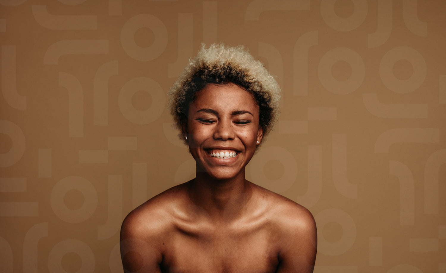 Close up of african american woman laughing. Woman with short curly hair on brown background.
