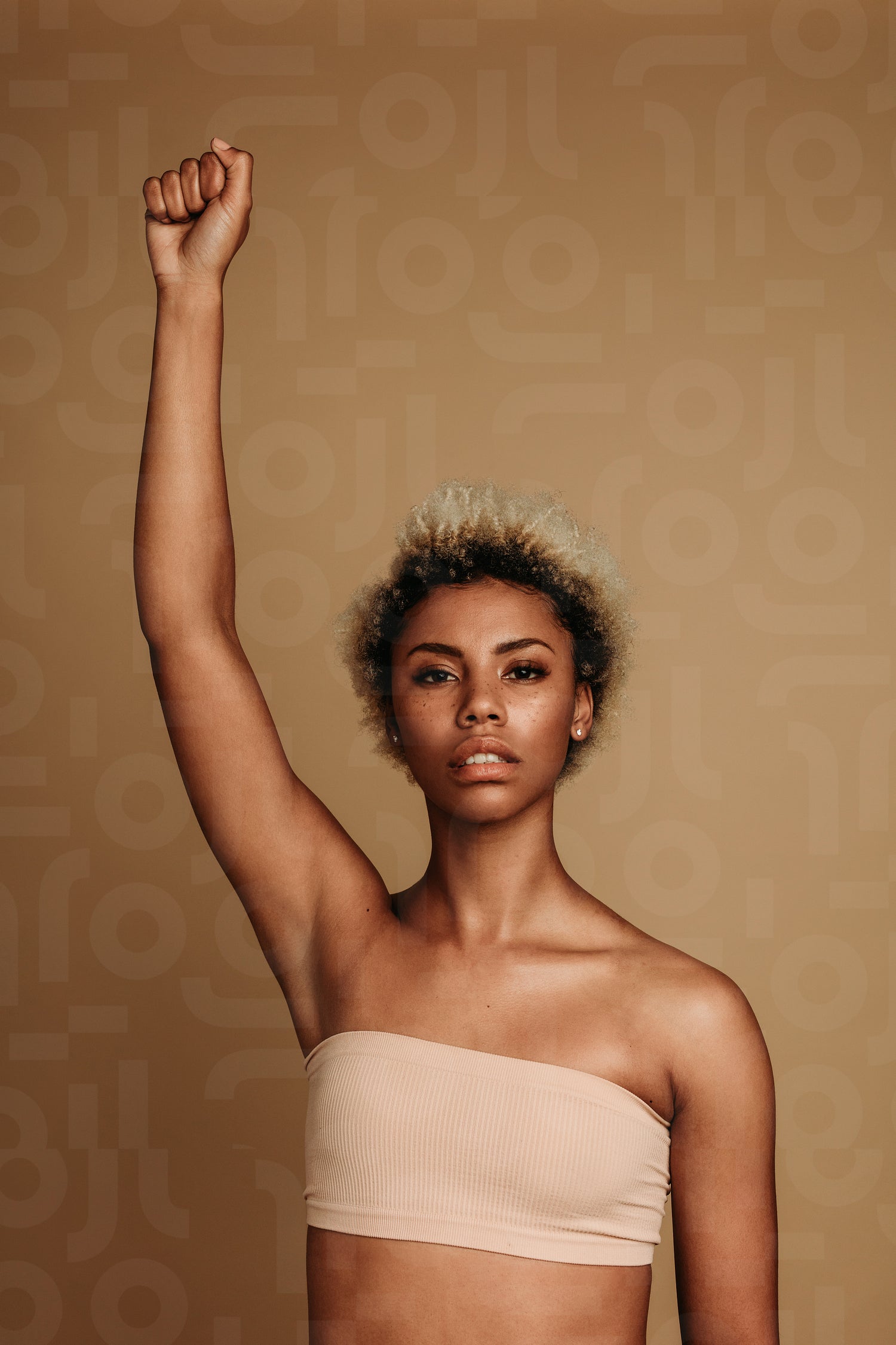 African american woman standing with her fist raised above head. Woman supporting the black lives matter campaign.