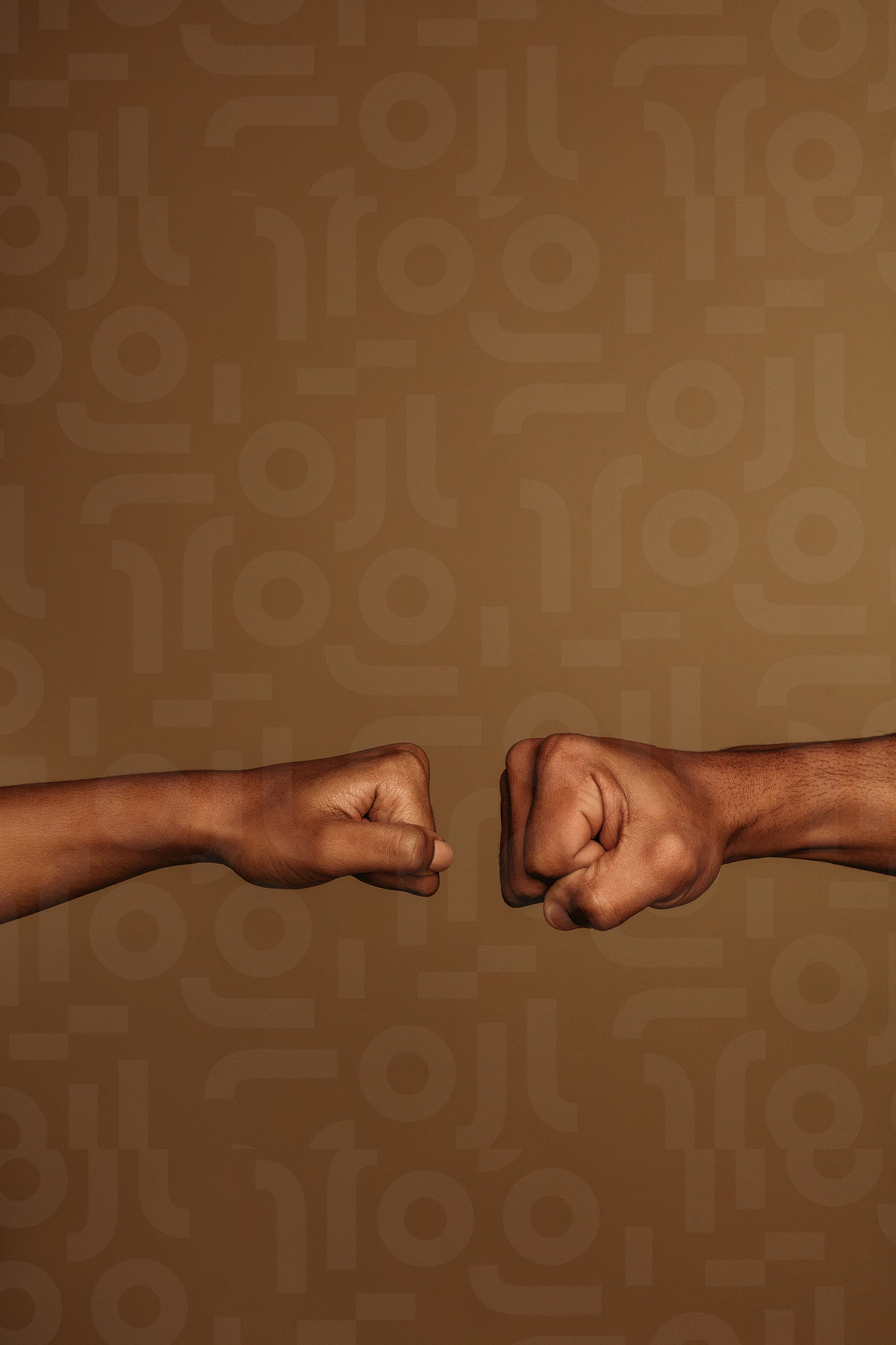 Cropped shot of two fists isolated on brown background. Two fists facing each other to greet.